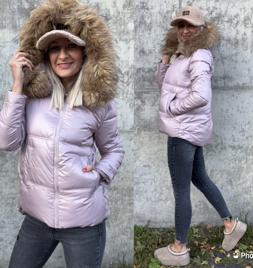 Zimní bunda v lehounce asymetrickým střihu, přední část kratší - zadní lehce prodloužená. Kožíšek na kapuci lze odepnout.