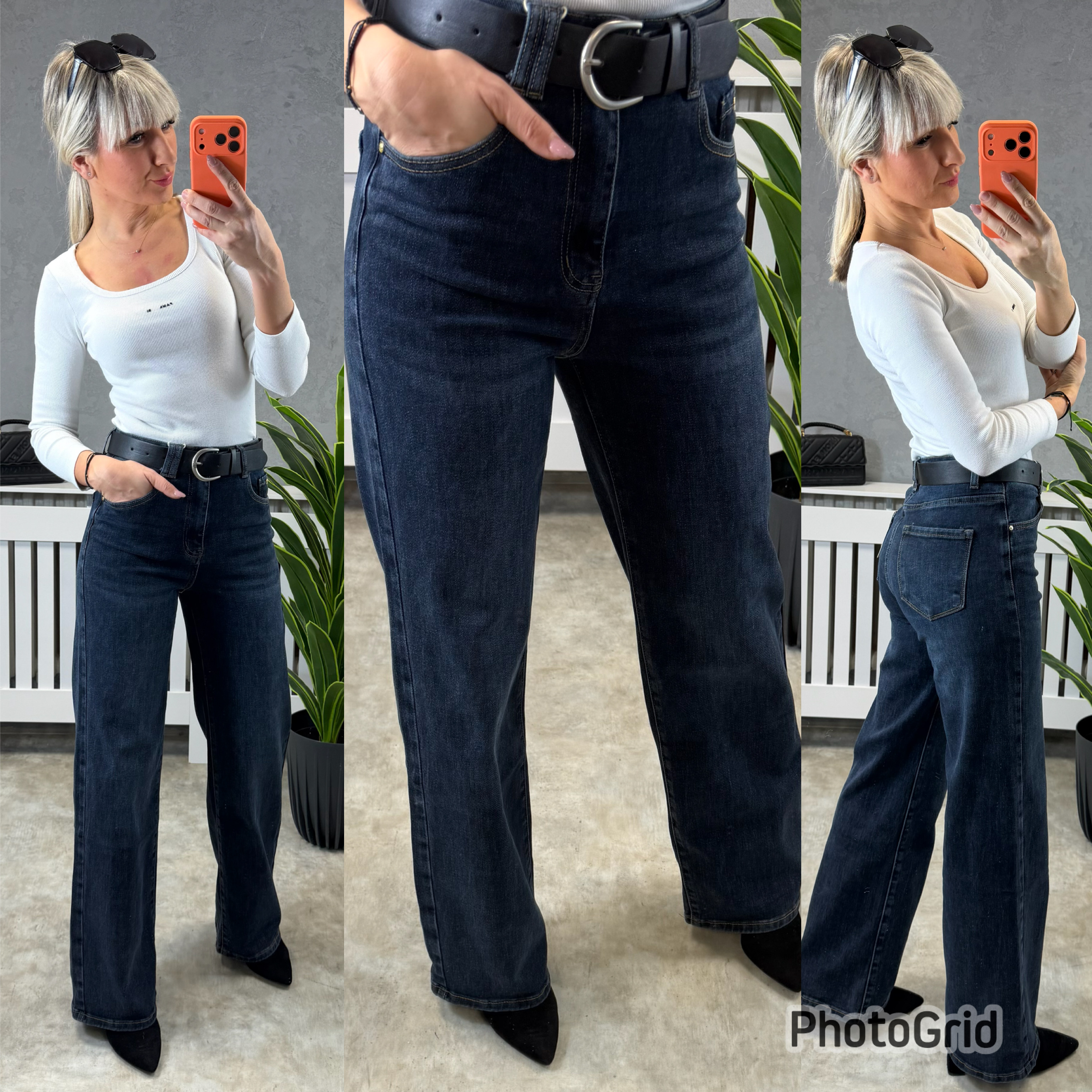 Tmavě modré, strečové Jeans. Součástí balení je koženkový pásek. Jeans mají rovný střih.