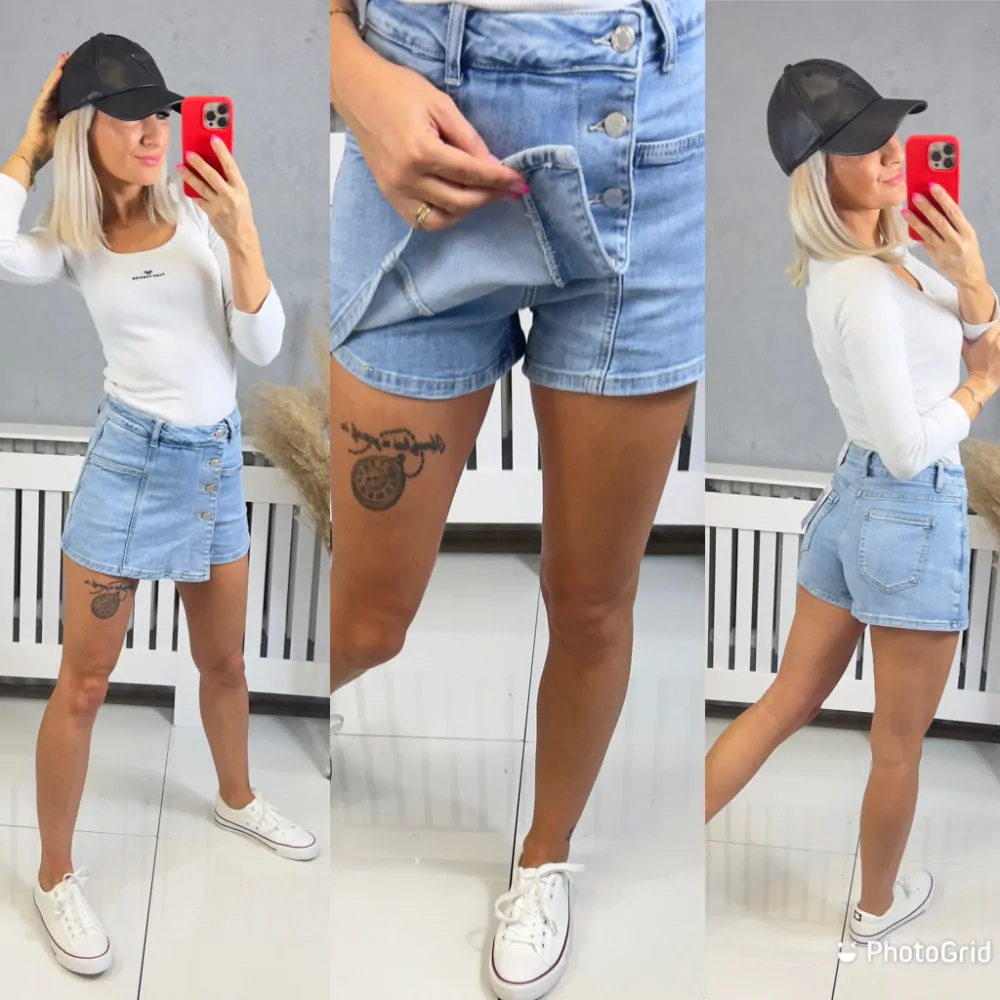 Stylové denim kraťásky, zepředu vypadají jako sukně.