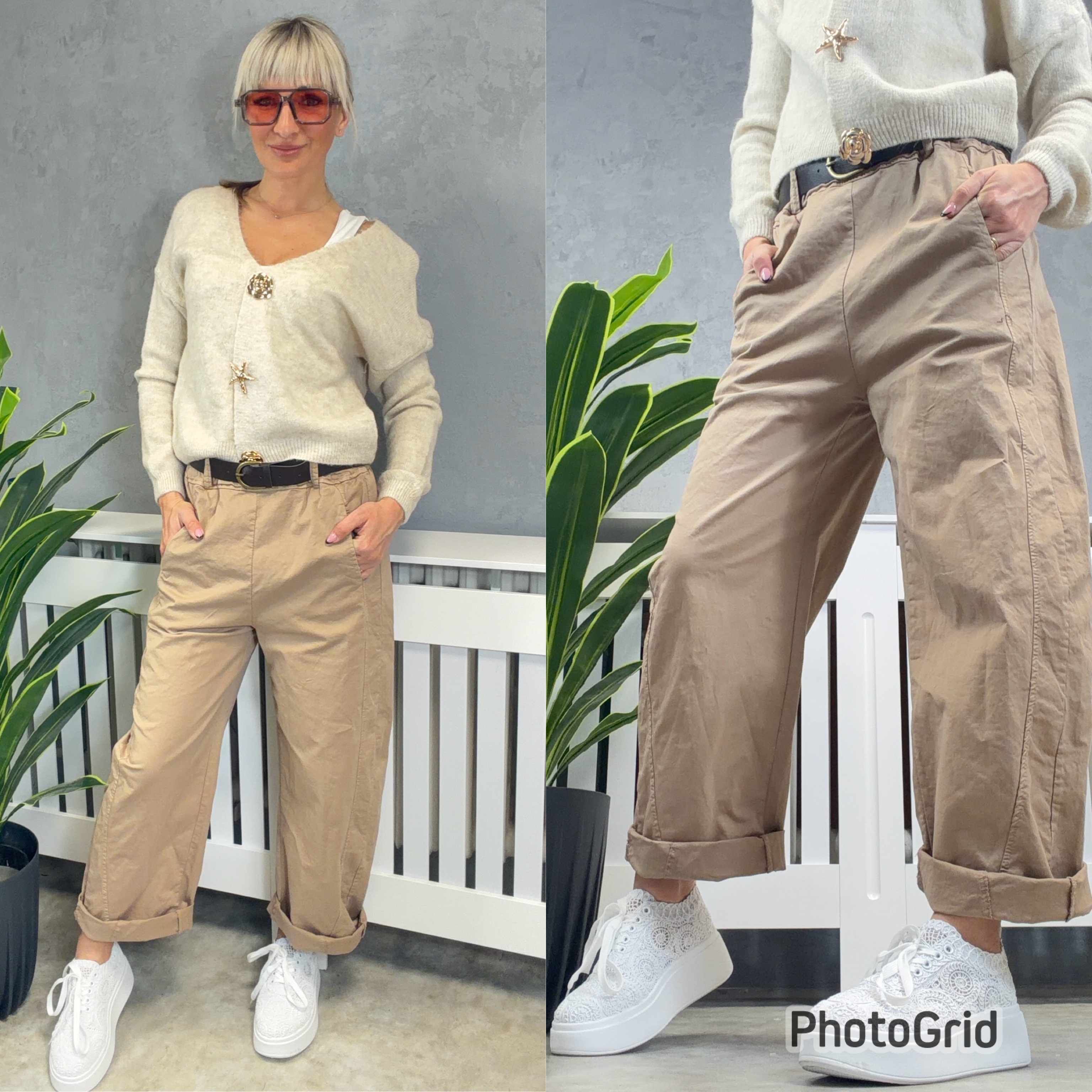 Luxusní plátěné kalhoty s gumou v pase a koženkovým páskem.