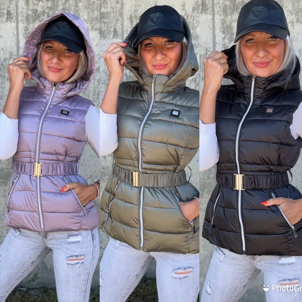 Stylová vesta s pružným páskem. Kapuce lze odepnout.
